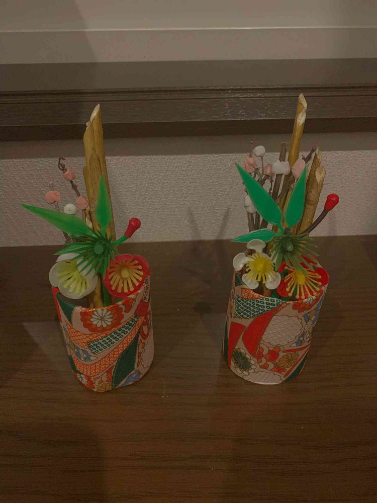 トイレットペーパーの芯に和紙を巻き、竹に見立てたのは、今年も元気な木になっていた、アスパラの茎です😁