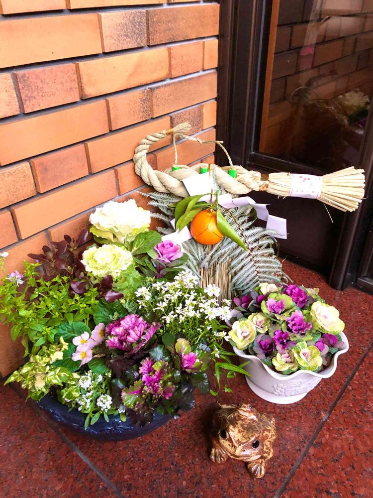 11月に作った寄せ植えと、お正月用の葉牡丹オンリーの寄せ植え、ドアに飾るしめ縄です🎍