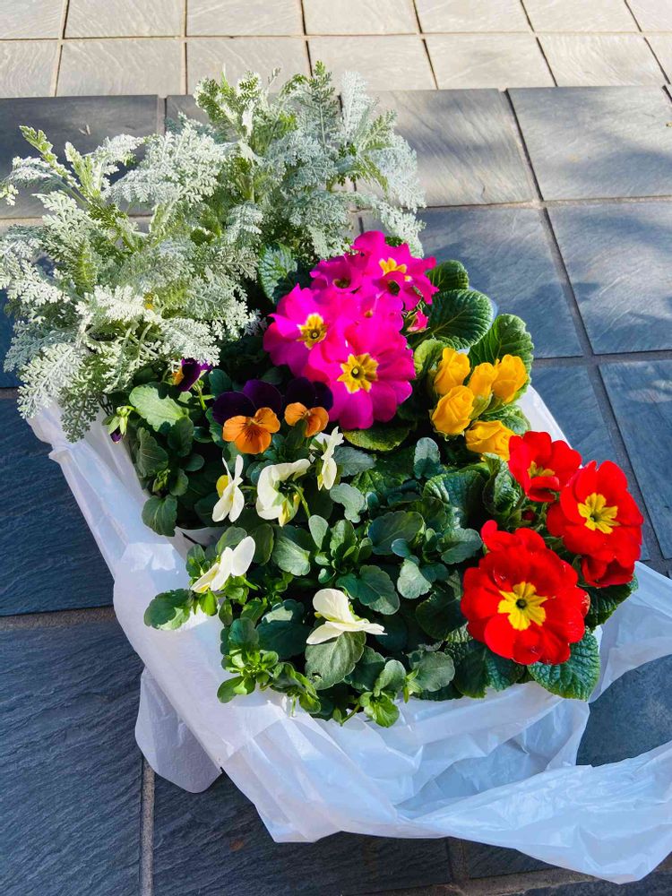 この写真は今日の実家の玄関先、母が庭に植えてくれるのを待っているお花達です。