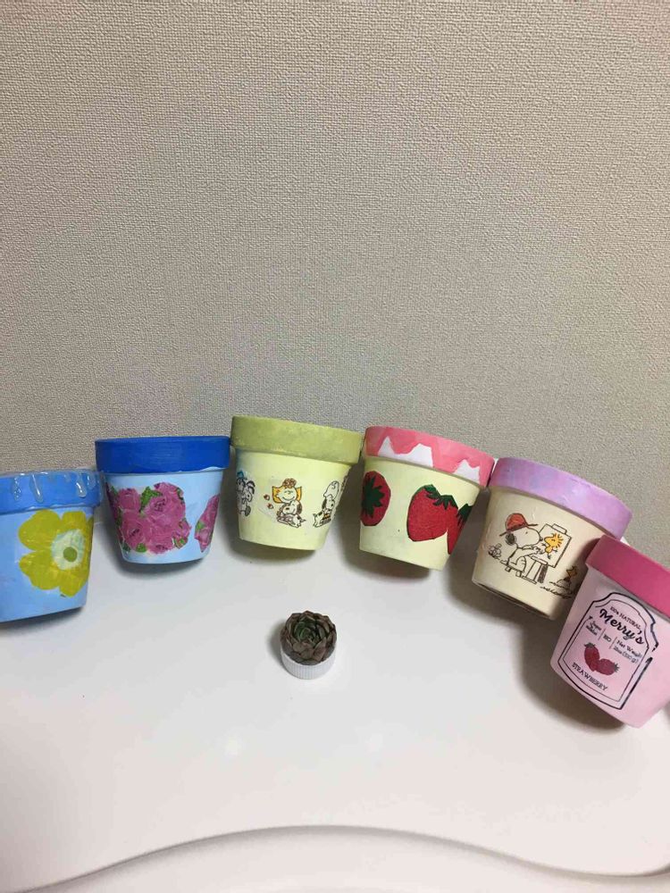 初めてなのでよくわからないのですが、このスヌーピーの柄をリメ缶に貼ってる人がいらっしゃったので鉢に貼り付けて見ました。