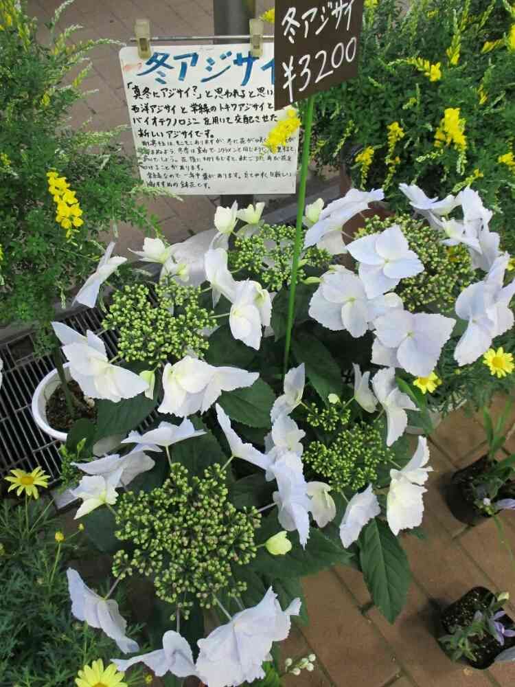 POPには、「西洋アジサイと常緑のトキワアジサイとをバイオテクノロジーを用いて交配させた新しいアジサイです」