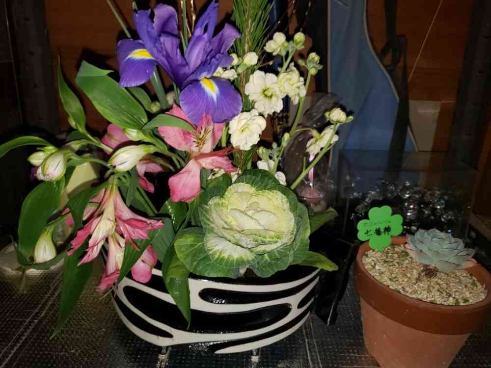 写真は母が生けた新年用のお花に、縁起がよいと言うことで七福神を並べて。