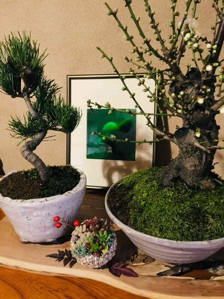picは主人が植えた松と白梅の盆栽です❣️