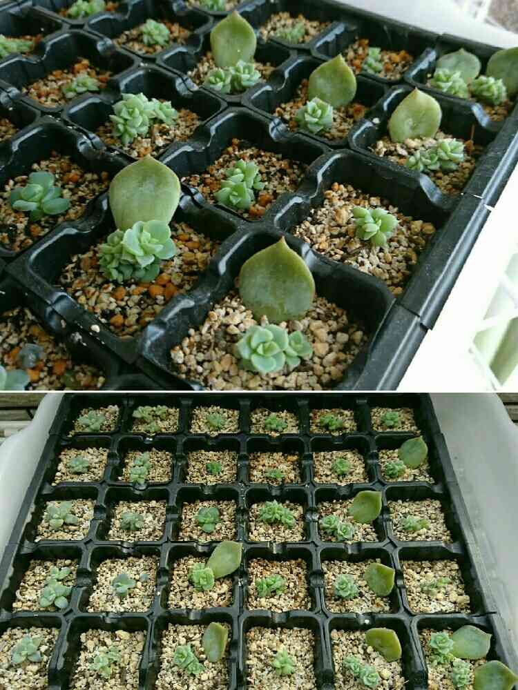 葉挿しはじめで たくさん大きくなったのは白牡丹とかブロンズ姫みたいな成功率高いのだけ💦 他のは いっぱい干からびさせたり 真っ黒にしちゃってます(ToT)