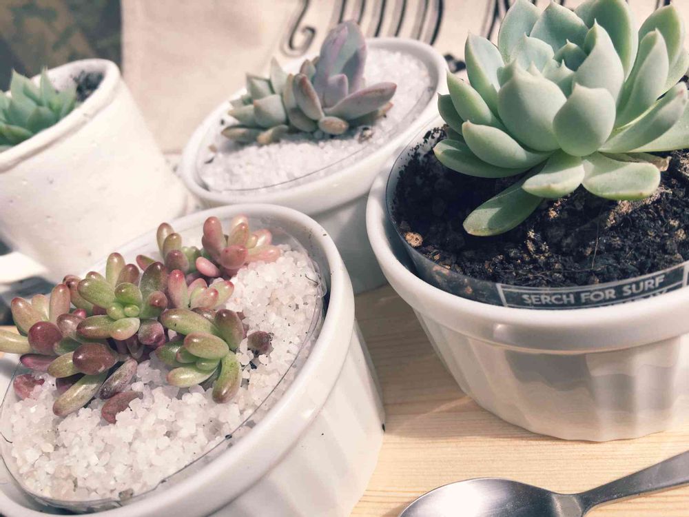 白いカラーサンド敷いたココット植えも