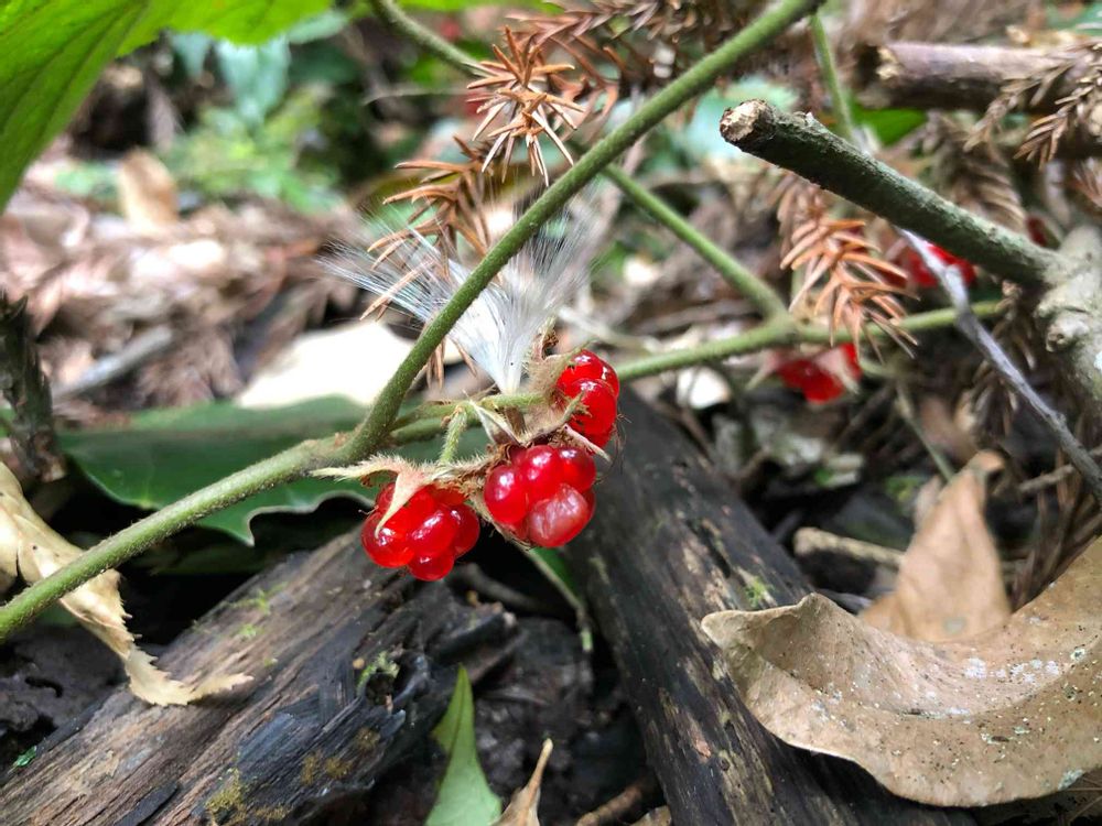 テイカカズラの種子がフユイチゴの赤に乗っかってて綺麗でした。