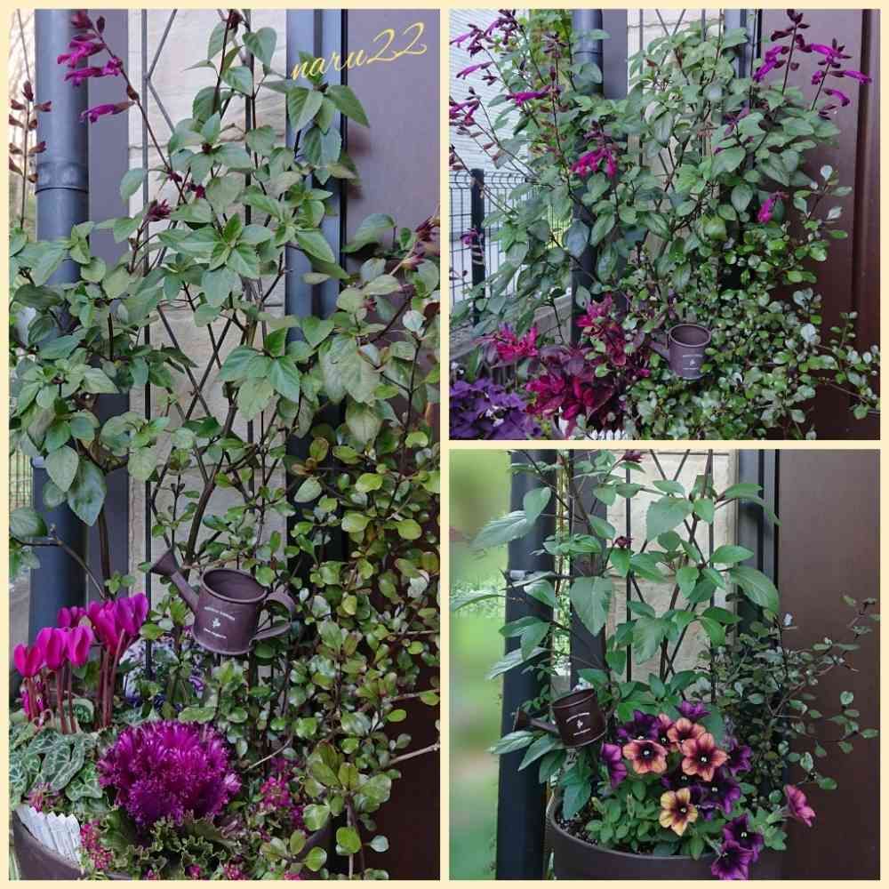 サルビアとコプロマスはそのままで春(右下)はペチュニアと、夏から秋(右上)はアルテラナンテラと、そして冬は葉牡丹、ガーデンシクラメン、アリッサムと寄せて、四季ごと植え替えをして楽しんでいます😆💓