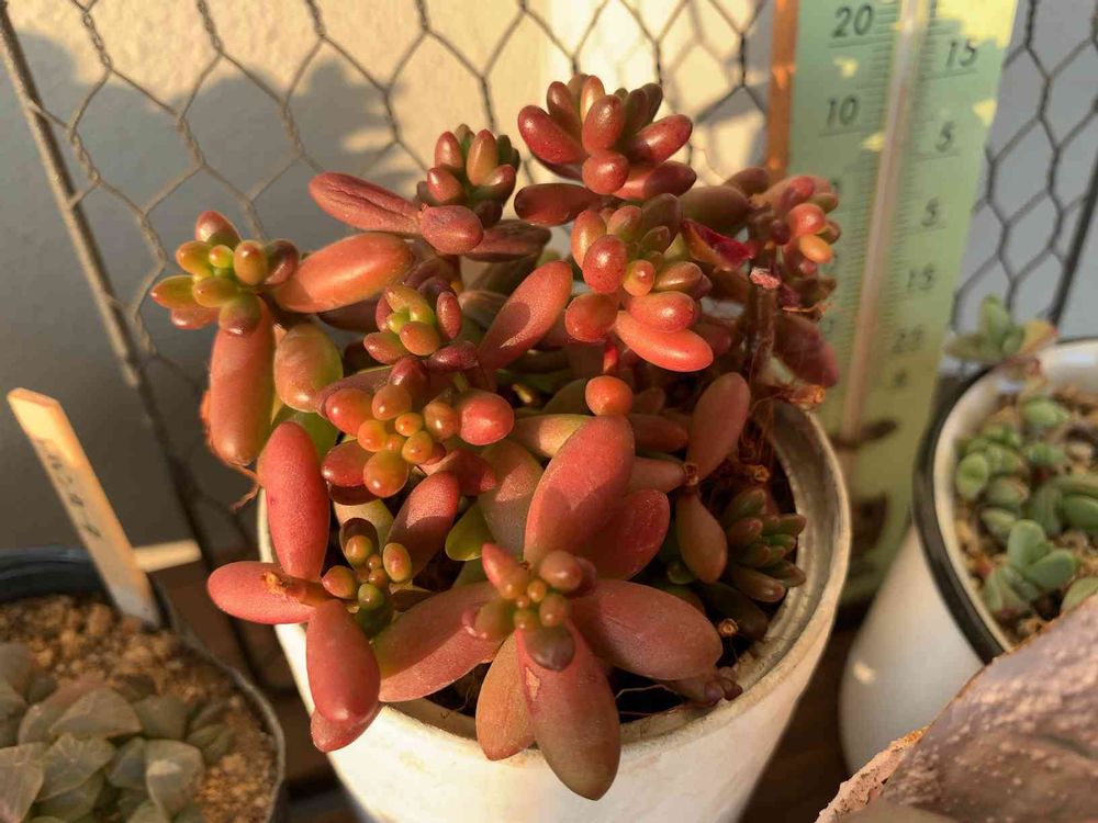 今年は本当に暖かくて他の多肉は紅葉がまだまだ弱いですけど、虹の玉やっと赤くなりました✨