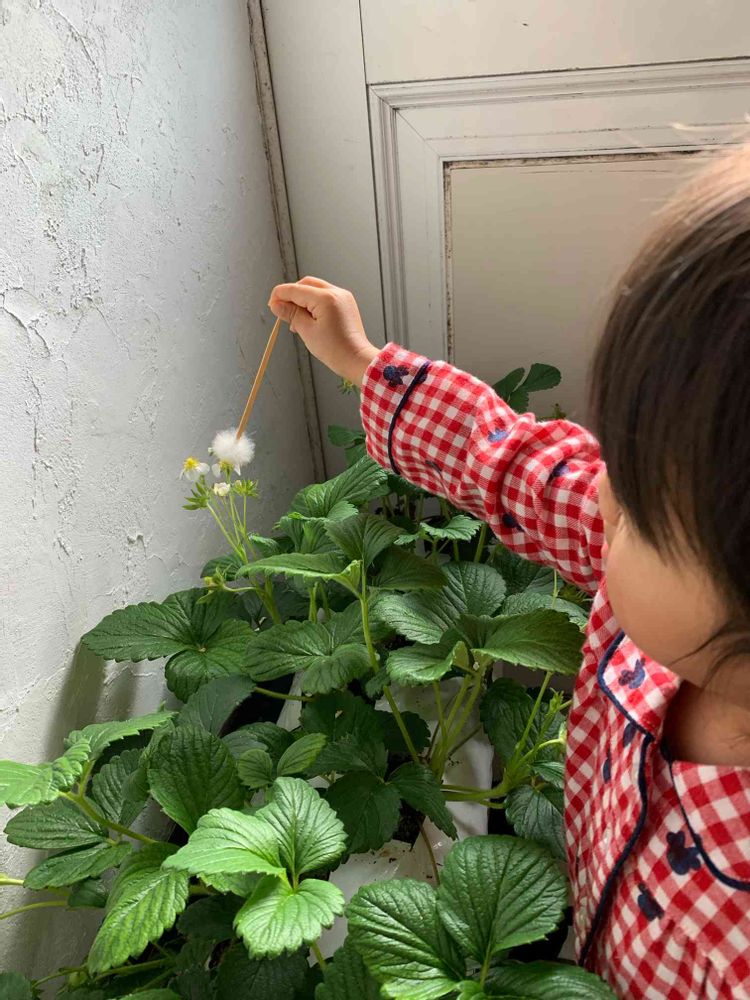 実が膨らみ始めてるのも数個見つけて『いちご』『いちご』と喜んでいます💕