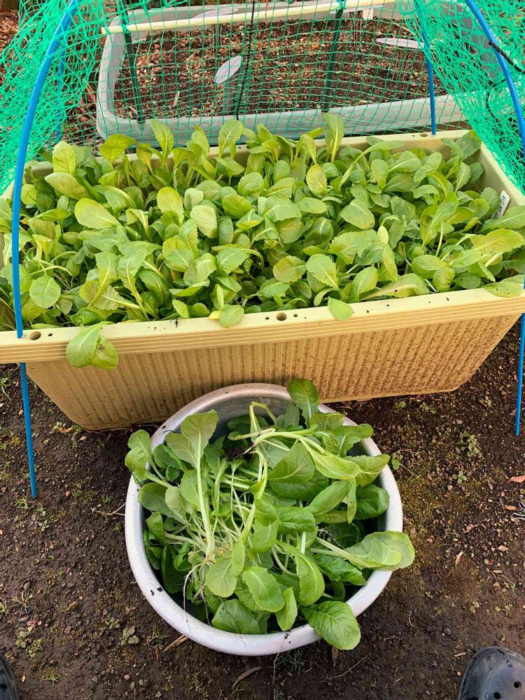 おはようございます。100均の三池高菜、今年の初収穫です。お浸しにします。ヒヨドリに食べられないよう網を掛けました。