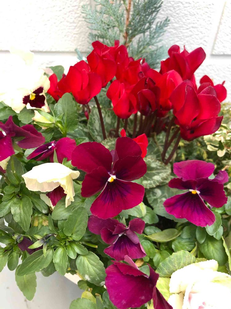 赤いシクラメンをメインにビオラ、パンジー、ミニ葉牡丹、プミラ🌸🌼