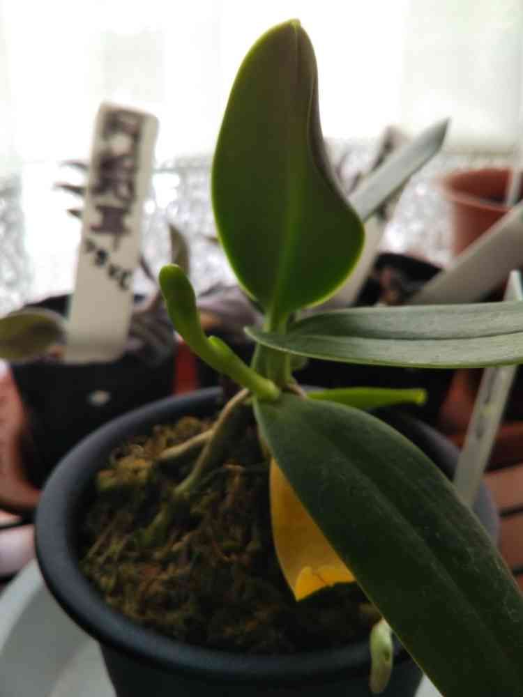 本日二投稿目❗️風蘭系統(?)ナゴランに花芽が伸びてる、😵💧購入して三年になったか、今まで一度も咲かないでいました。咲くまでの準備期間があるとは聞いていました。窓の外には積雪あります。大丈夫かどうしようか、私が一番心配してます。