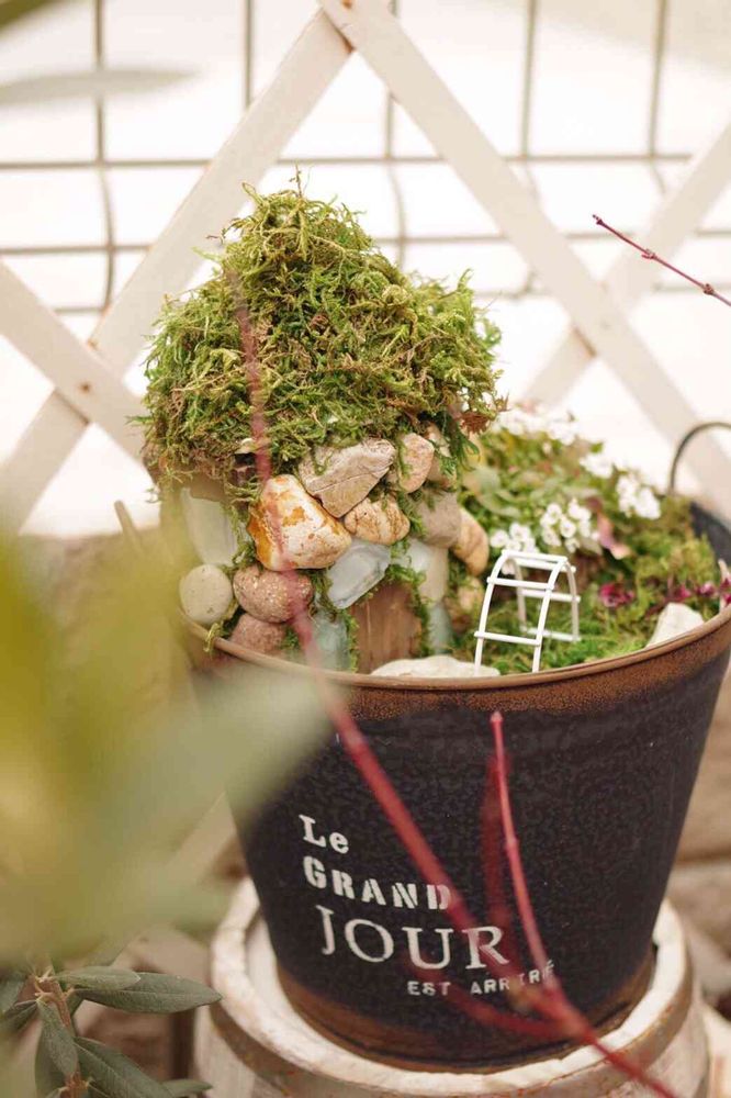 お庭の花壇に石のミニチュアハウスを作って飾ってます(*´∀`*)乾燥苔がいい仕事してくれました( ´ u ` )