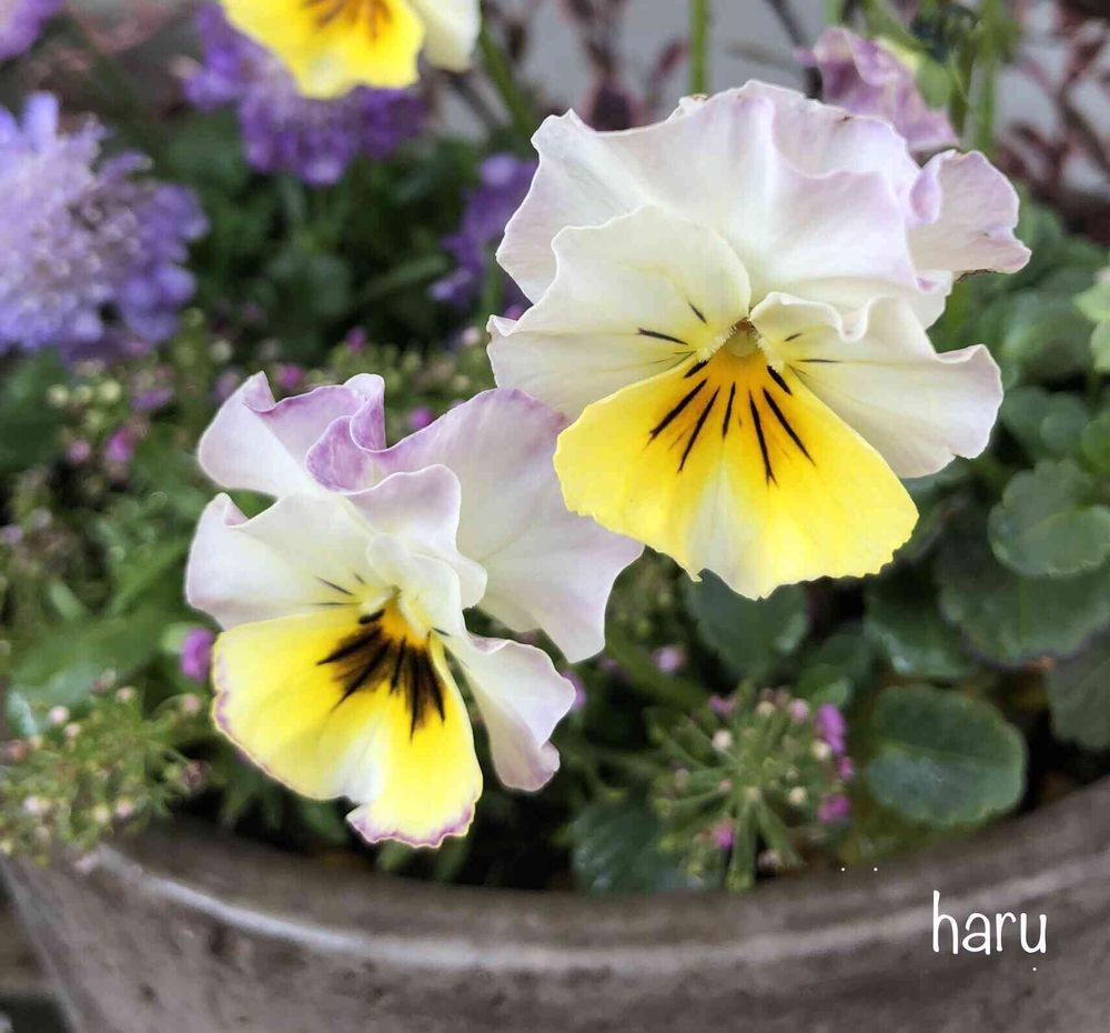 ふりふりのビオラと、スカビオサの淡い紫が綺麗ですね✨