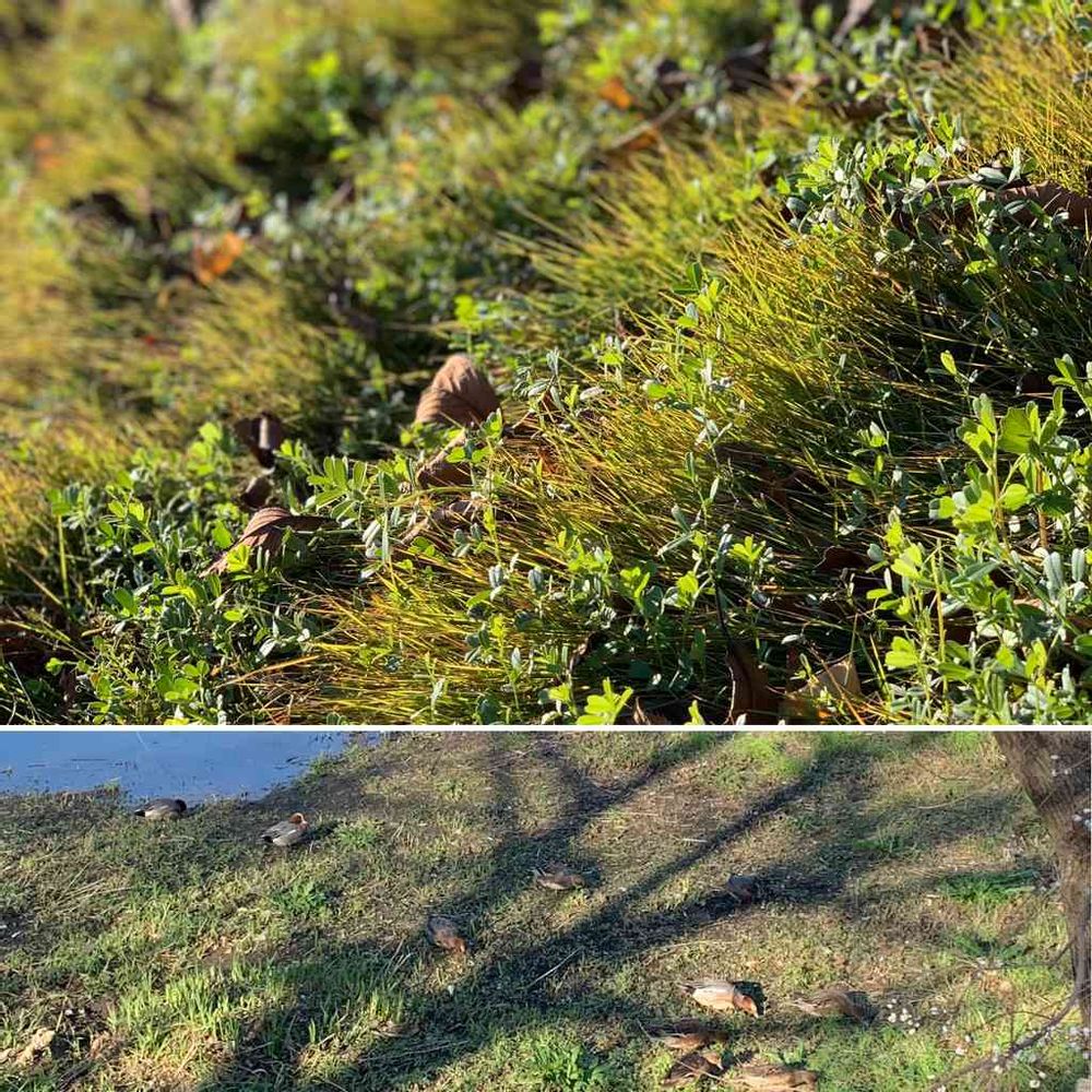 芝生と桜の落ち葉🍂池から列をなして上がって草を食むヒドリガモ...