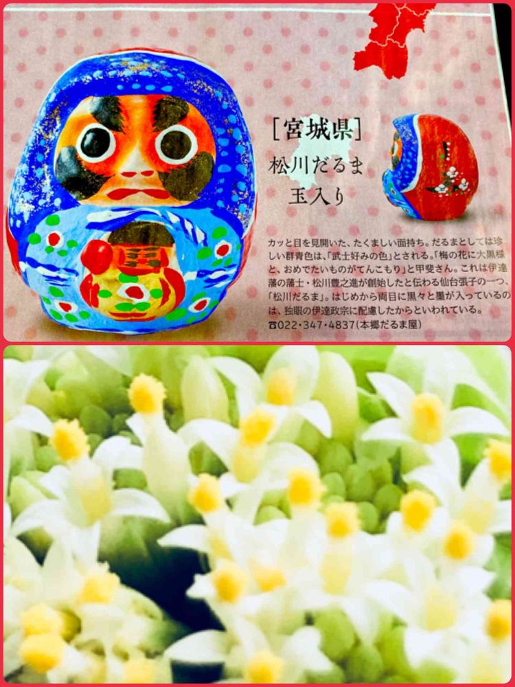 伊達政宗の派手な青色だるま(後ろは赤)と~可愛らしいフキノトウの花々で参加させて下さい‹‹\(´ω` )/››