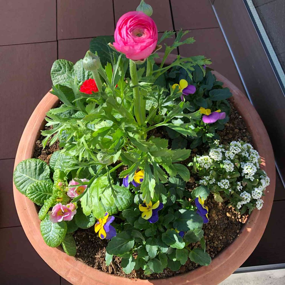 初めての寄せ植え。10日目。ラナンキュラスの存在感…(笑)つぼみの時に買ったから色わからなかったけどピンクだった😊めっかわ