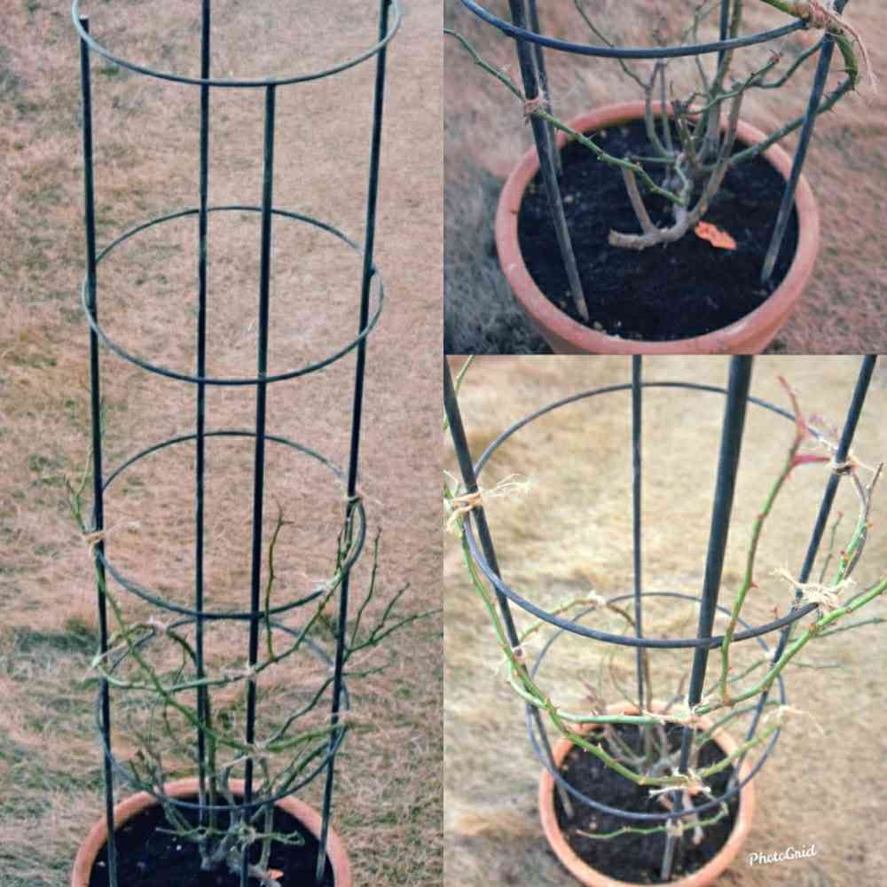 去年までシュラブ系の広がって暴れてしまった薔薇の鉢にあとからオベリスクを差しこんで間から茎を出す😱😱という恐ろしいことをやっていて😱