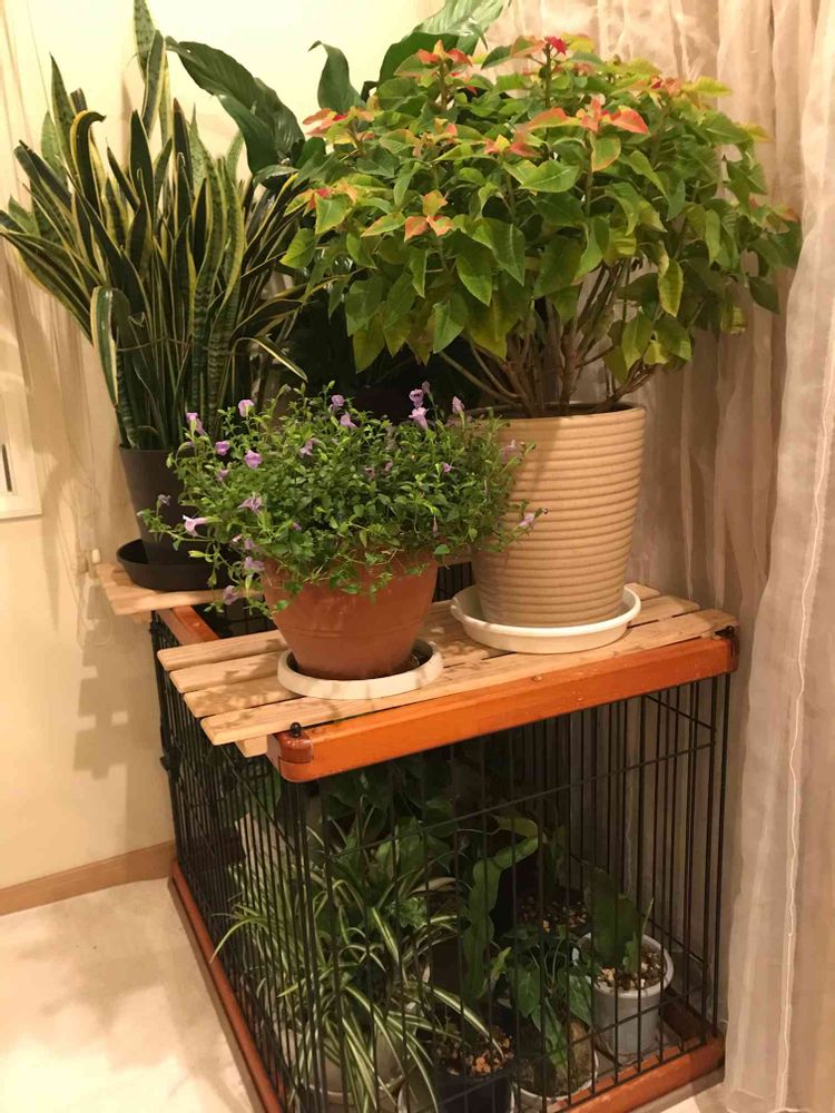 毎年冬になるとフェレットちゃんの対策兼ねてお部屋に植物を取り込む場所が限られるので、かって飼ってたワンコのケージで二階建てのお花置き場を作っています