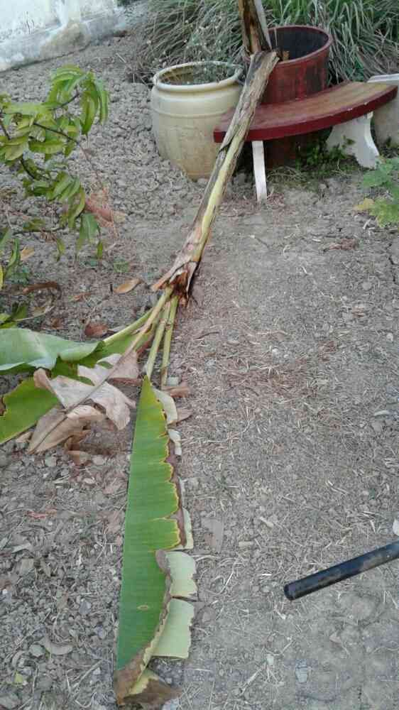 朝から悲報です。ご覧の通りに島バナナが倒伏していました。カットして中を見ると、虫食い穴から腐りが入ってました。現在掘り起こし中で根は生きている様ですが、腐りや虫食い穴の状態によっては再生不能かも知れません…タイにはない品種なのに。
