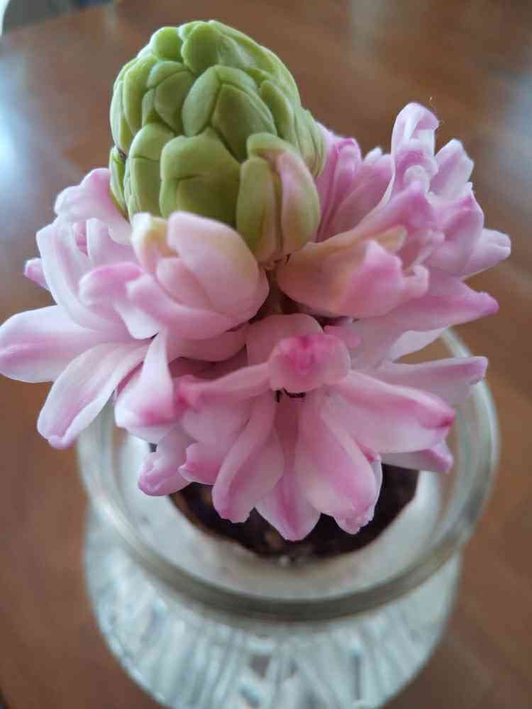 キッチンカウンターに、ピンクと紫のヒヤシンスを毎日成長を見守る中、ピンクが開きはじめました💖