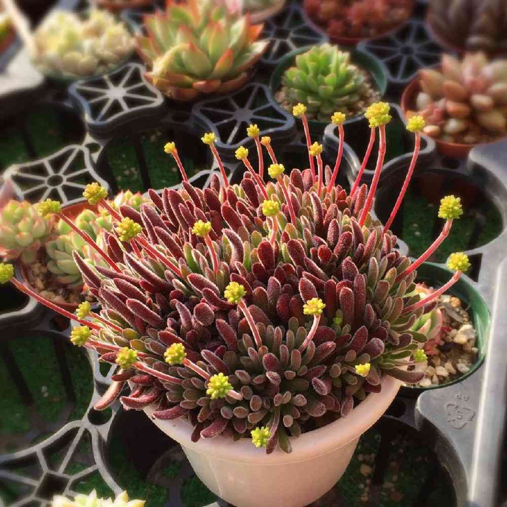 ろみたんさん、黄色い花芽とモケモケの赤い葉っぱがかわいいです!