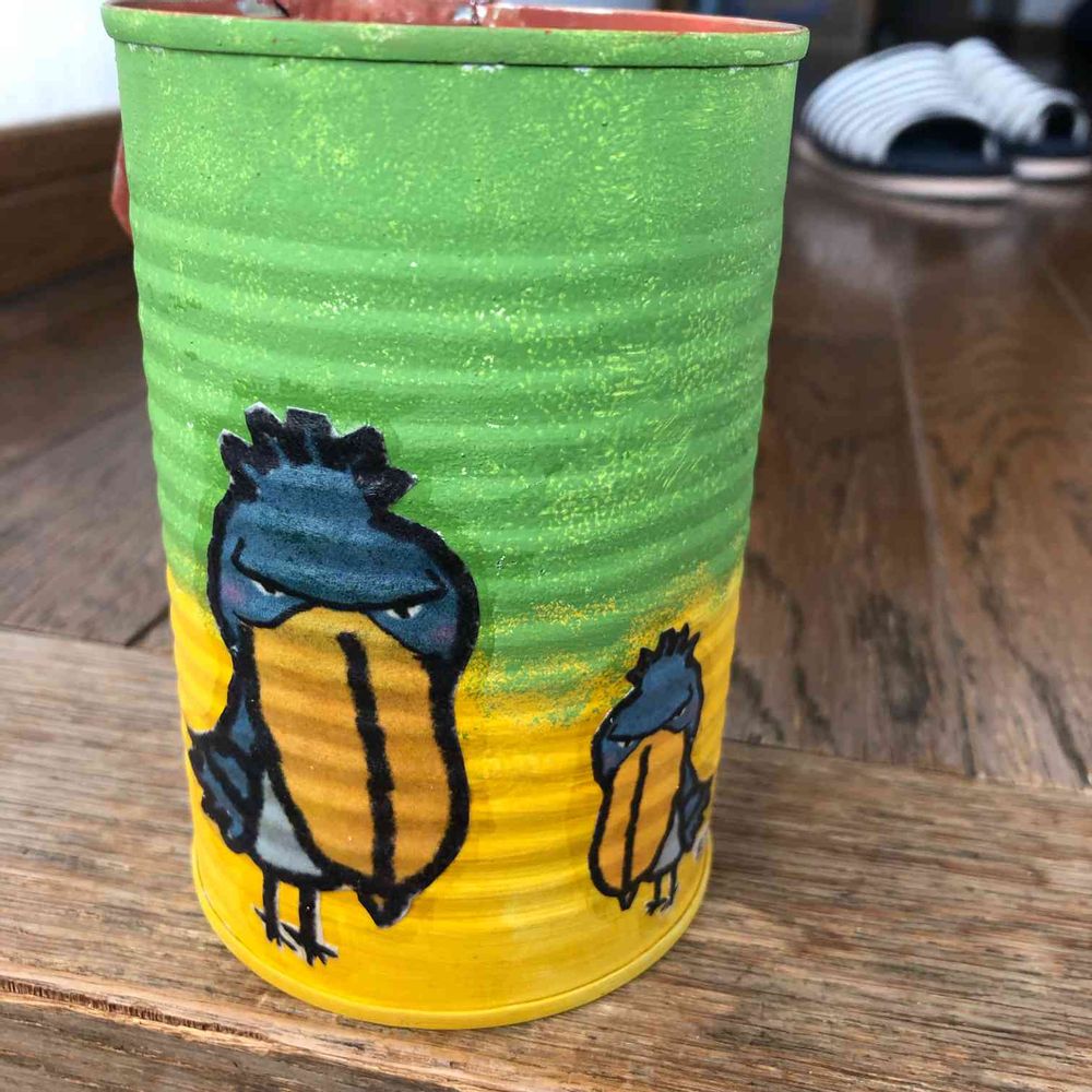 昨日の木工市でゲットした、ま~さんのハシビロコウ缶😊