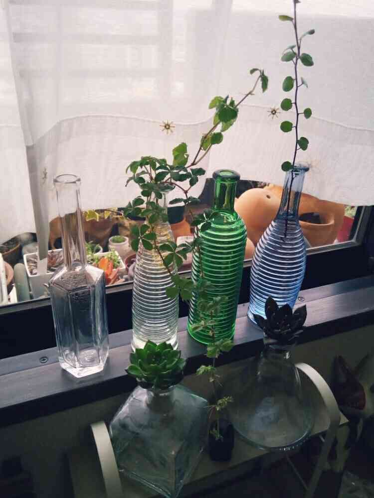 ベランダの片付けで出て来た いろんな形と色のガラス瓶