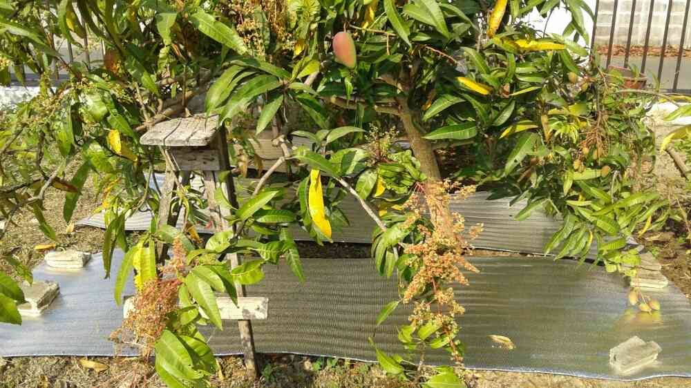 島バナナ倒伏処置の合間に、マンゴー玉文6号の木の下に反射シートを敷設です。例年樹冠内部の果実や、果実の下部の着色がイマイチだったので日光を下からも当てて着色アップです。