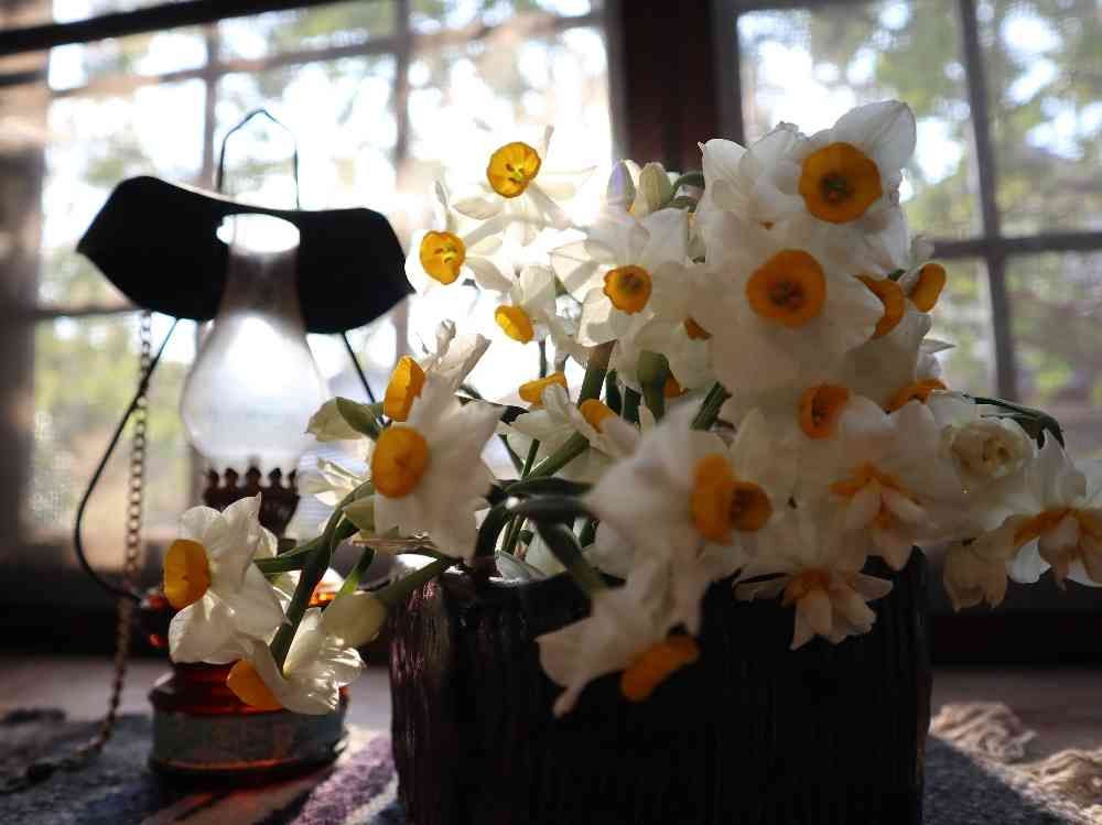 自作の品々、ランプ、窓辺に見える緑、木洩れ日、庭から水仙、何かフランスの小説に出てきそう(*゚ロ゚)✨