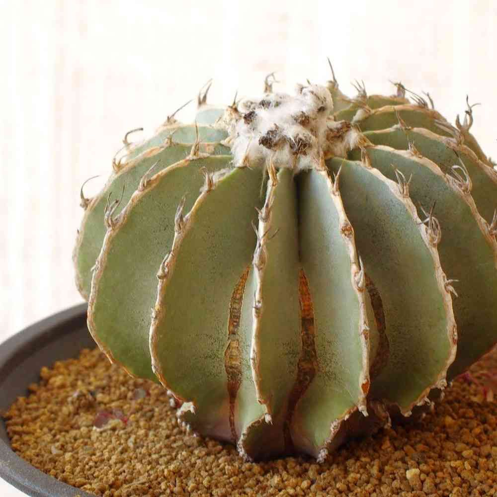 渋いサンドベージュのボディにシャープで彫りの深いリブがクールで大人びた雰囲気の個性的なサボテン。近くに住むアズテキウムのヒントニー Aztekium hintonii と共にメキシコの北東部ヌエボレオン州にて90年代に発見された新種で、そのごく限られた生息域と乱獲によって絶滅が危惧されている希少種(今は現地の人の手で厳重に守られていてレッドリストランクは控えめ)。サボテンの中でも特に生長の遅い種で、数センチになるのに5〜6年かかるとか。実生も進んでいますがまだまだ数は十分ではなく高価なサボテンの代名詞になっています。