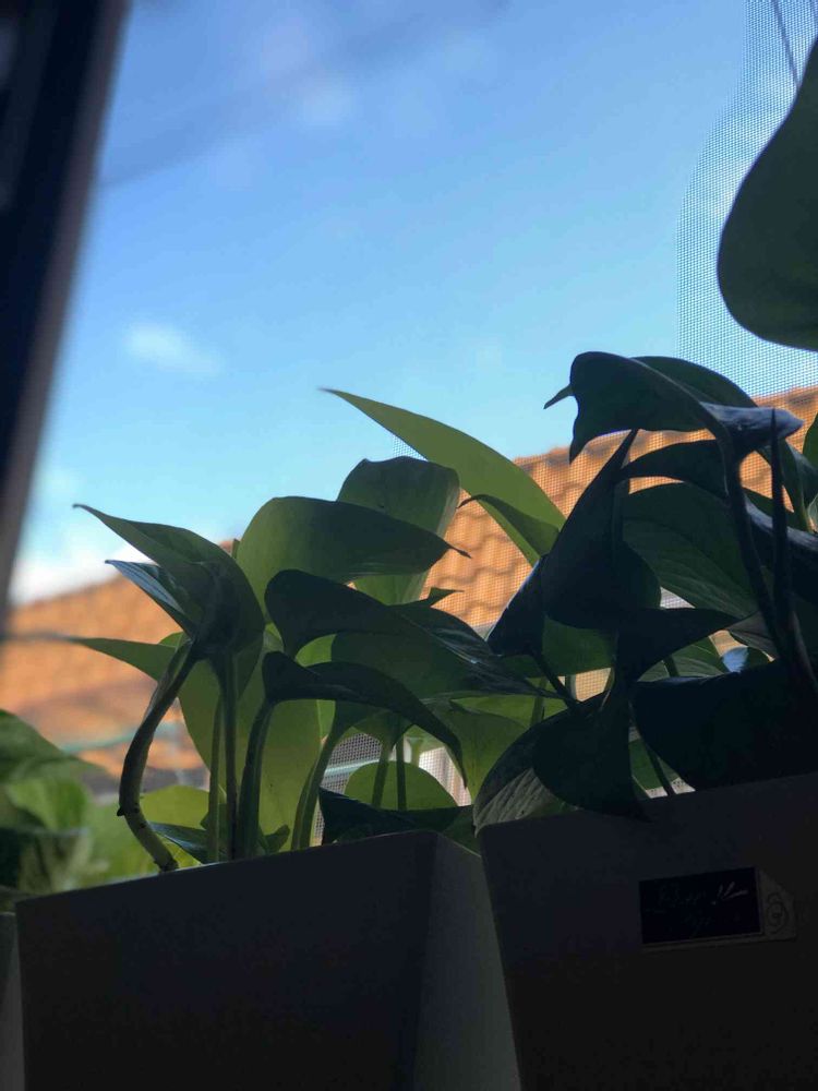 お隣のオレンジ色の屋根と青空、そしてポトスライム🌱です💕