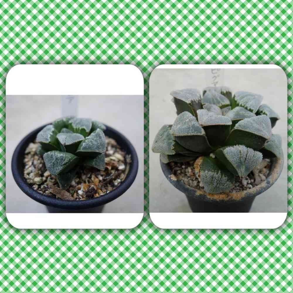 おはようございます。ハオルチアピグマエアの二年間の成長です(鉢は変えていません)。三角形の窓が砂糖菓子のようにすりガラスなのが可愛いですね!