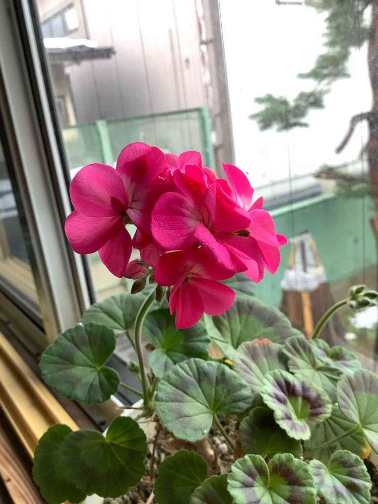 暖冬の今年は窓から見える庭に雪がありません!でも花達は越冬中です。唯一咲いているゼラニウムです。