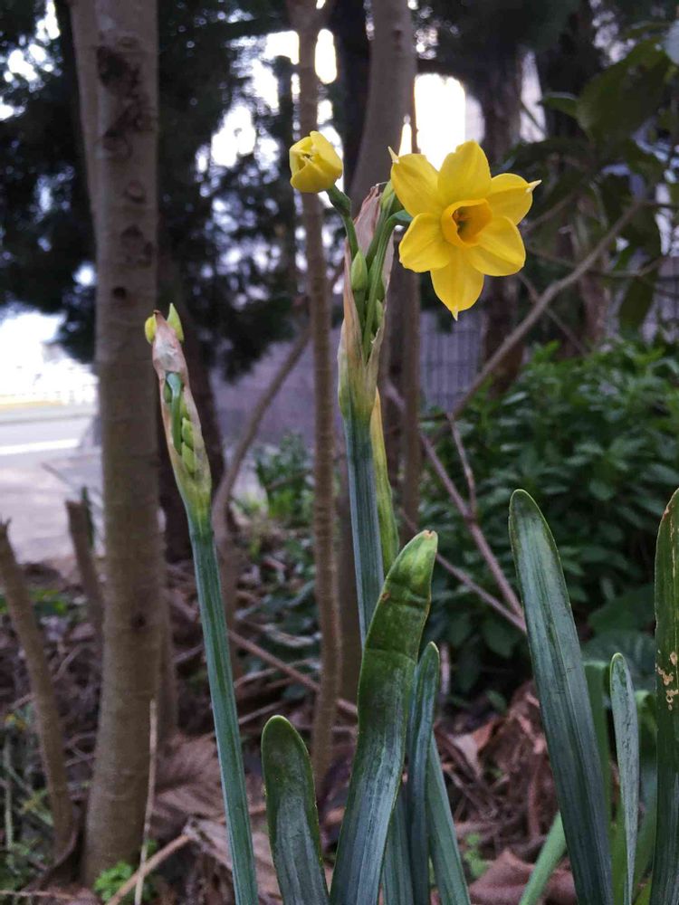 落ち葉や枯れ草をぬって、にょきっと伸びて花を咲かせた黄水仙。
