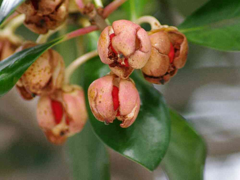 10月~11月頃 赤く熟すと この写真のように 不規則に裂け、1~4粒の種が顔を出します。