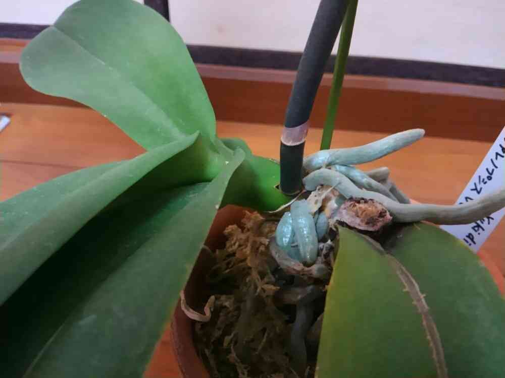右側の葉っぱ1枚、中心もポッキリから再生した胡蝶蘭。