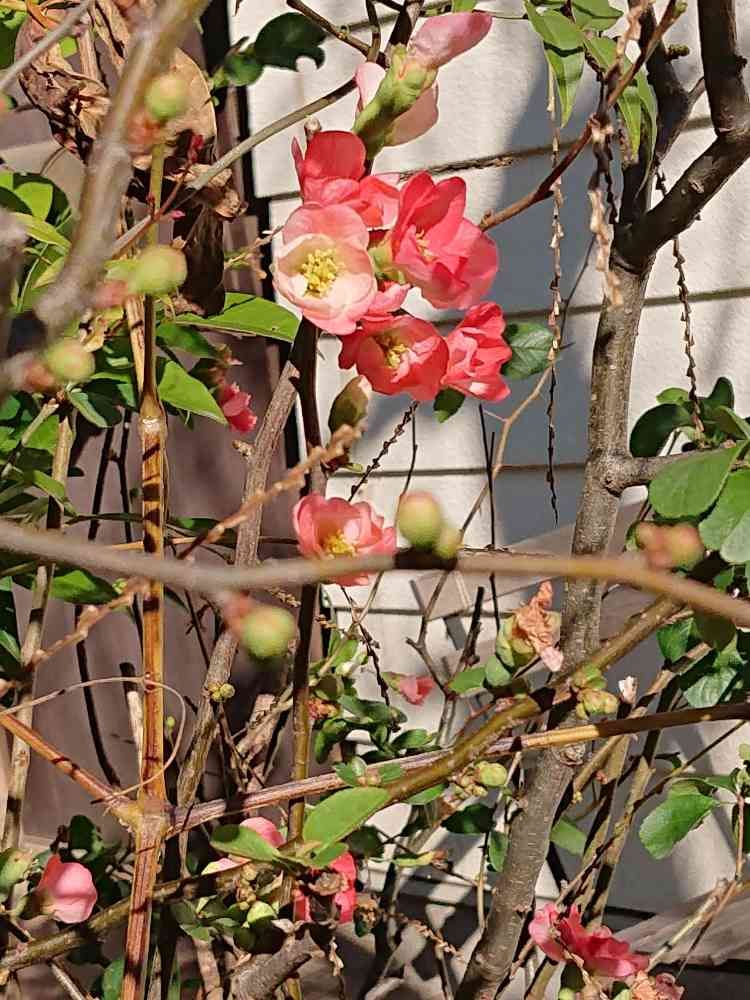 この木の先陣を切って、咲き始めたボケの花達。