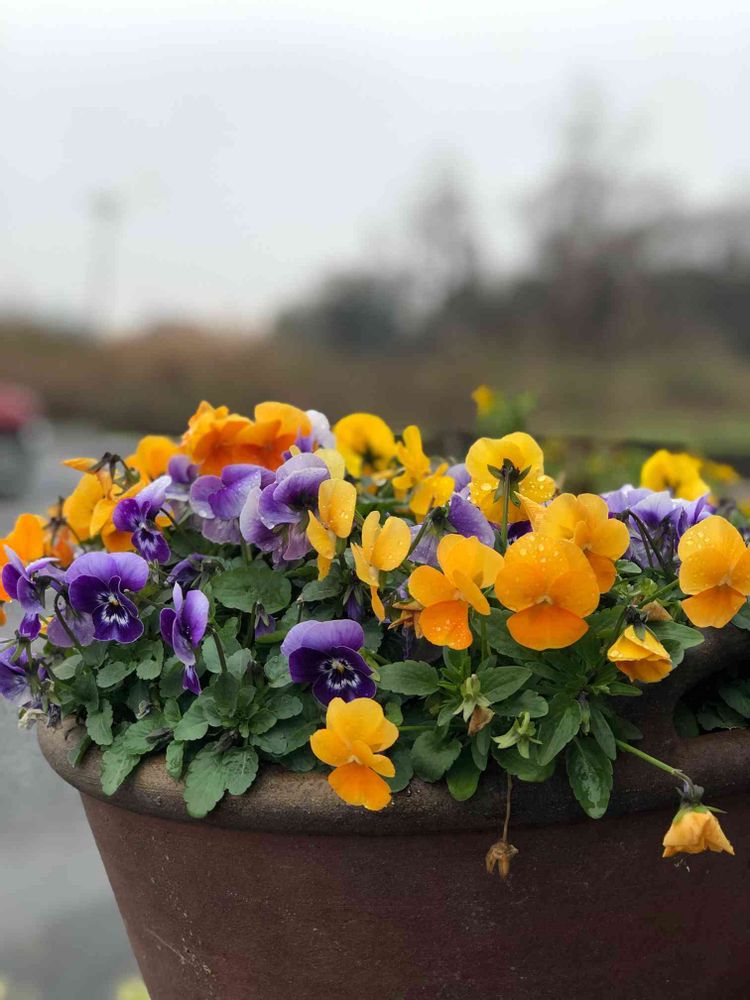 雨の日のカフェ入り口にビオラがモリモリで咲いてました。