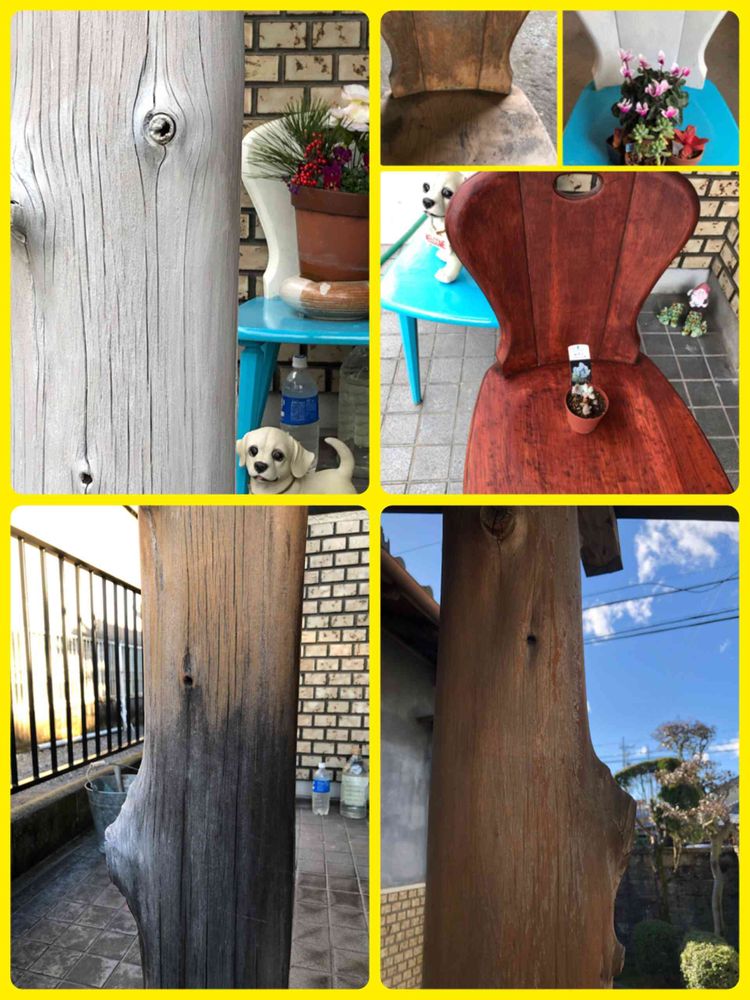 左下 日光や雨が当たるとこは、黒ずんでいる。上半分の茶色部分は、ペーパーかけて磨いた部分。