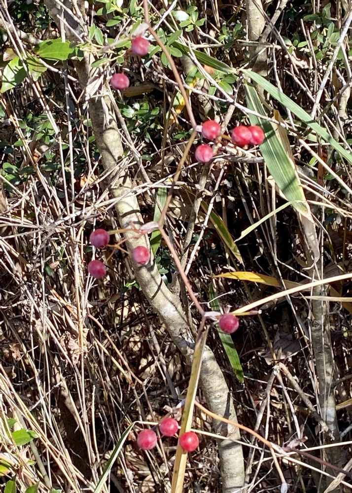 子午線が公園内を通るので、子午線の森公園と名付けられた里山を散策しました。花は既に無くヤット見つけた赤い実の“サルトリイバラ”。別名“山帰来”、クリスマスのリースの材料としても人気ですが、山を歩く方にとってはトゲが厄介な邪魔物ですね。