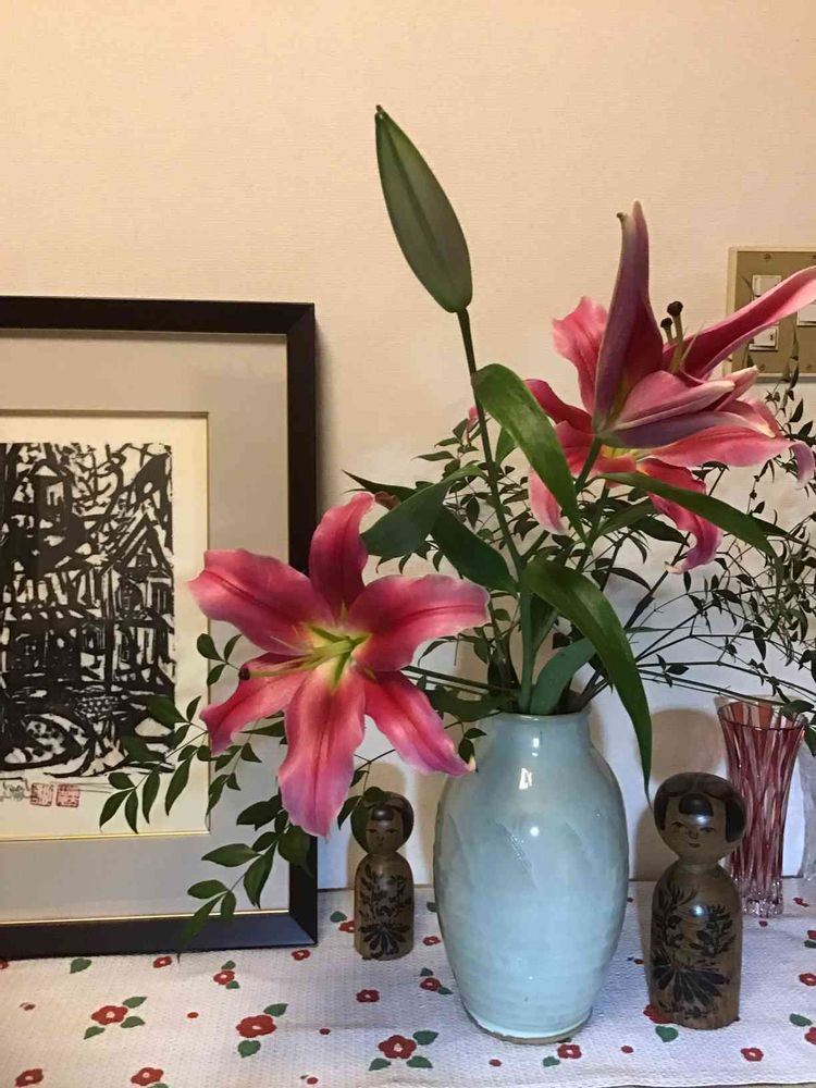 台の 上で 包んでいたら、近く だったので 、ふと この色の 大きな百合 が 目に👀 入ったのデス‼️