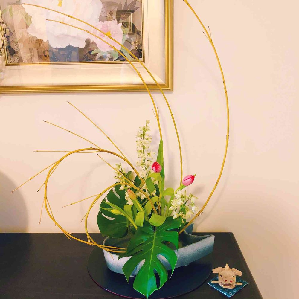 竹が細くなったような枝を使用。曲げても折れにくく動きが出せて楽しく生けられた!