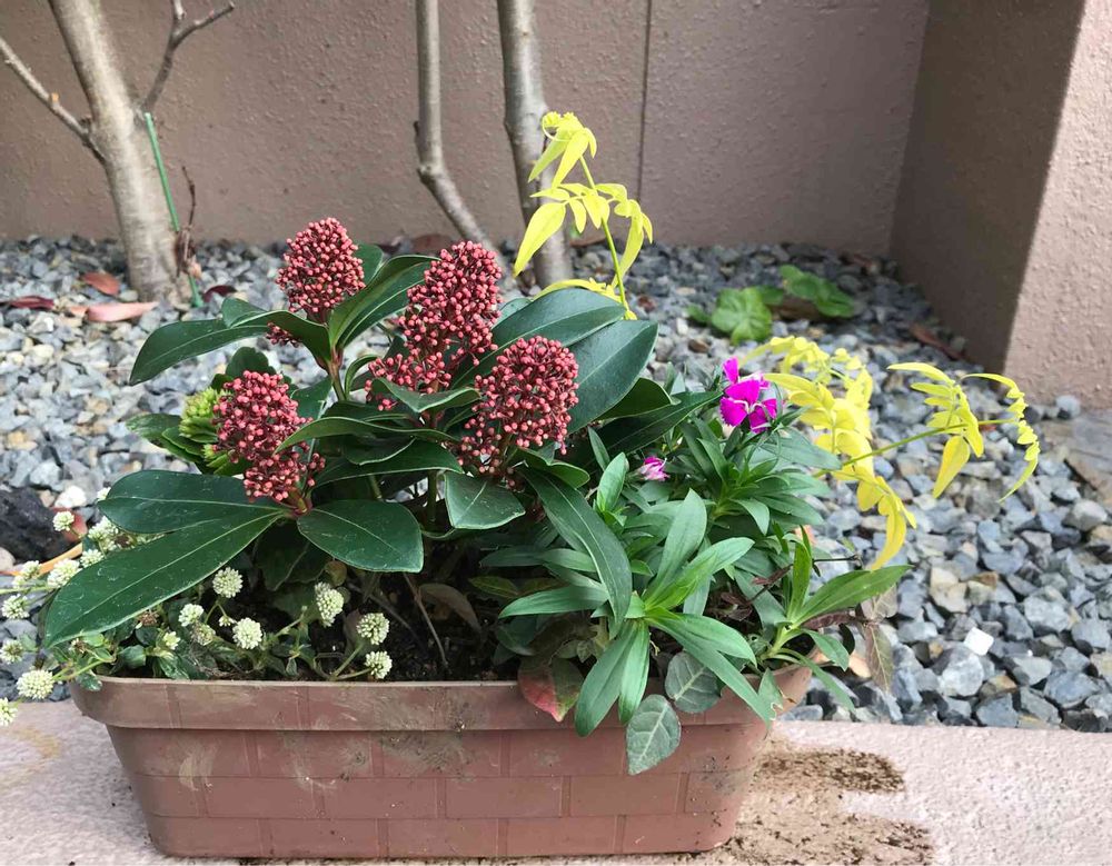 昨日、名古屋市内の花屋さんで【ジャスミン フィオナサンライズ】、【ポリゴナム ティホン】と赤い粒々の房の木を買い、家に帰ってから適当に寄せ植えしました。