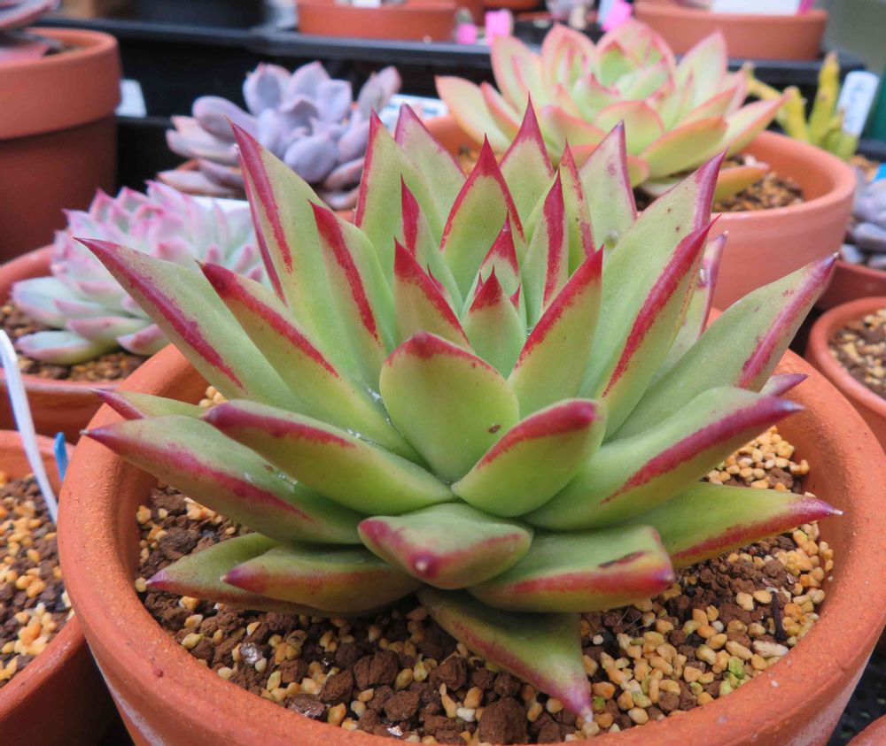 年を越してエッジの紅葉が急に進んだ魅惑の宵。ピンと張った赤いエッジの効いた葉が密集する姿は、アガボイデス系ならではで、何度見ても見飽きない。