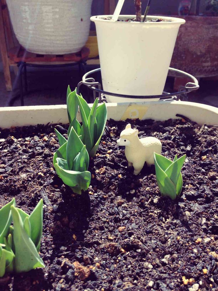 今日は暖かい〜😌先日からチューリップを観察してますが、日に日に成長してます!アルパカさんだんだん小さく見えて来てます。