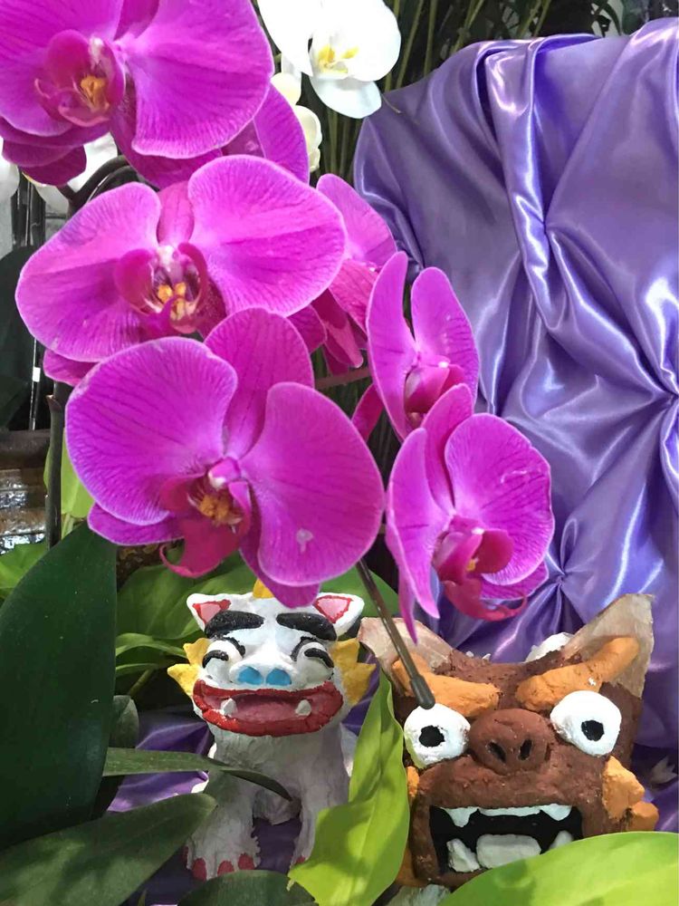 ユニークなシーサとコチョウランがいっぱいコラボして楽しい🤗