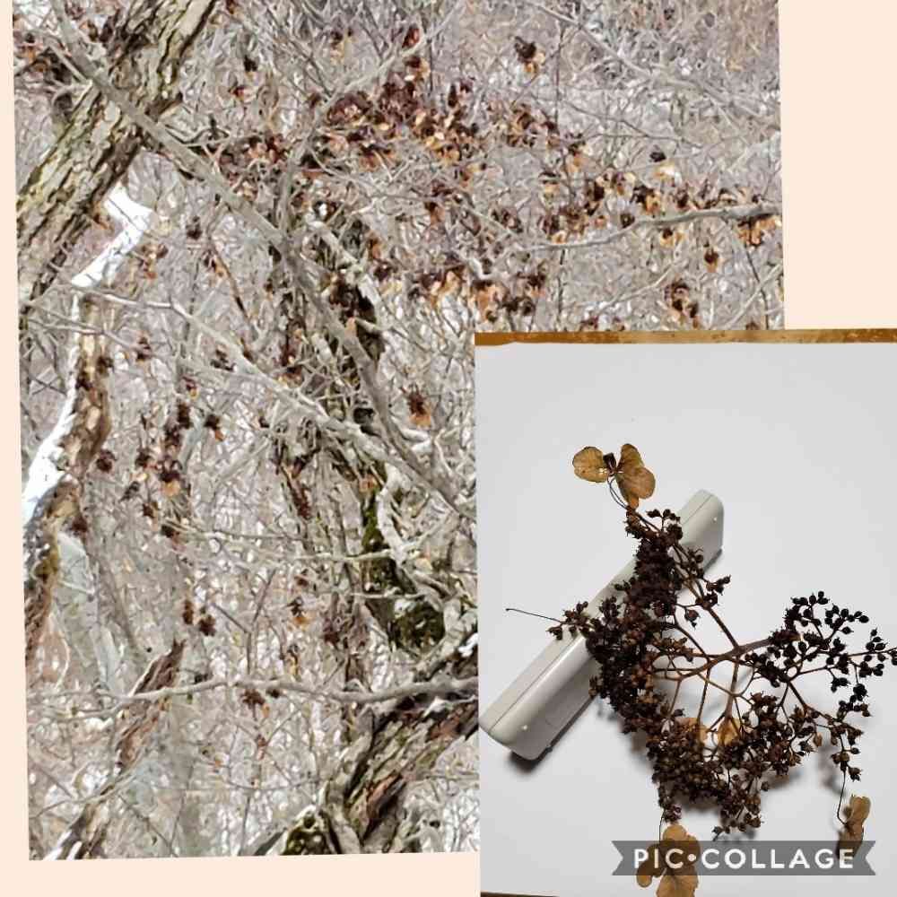 樹木に絡まるツルアジサイと雪原に落ちているツルアジサイの天然ドライフラワー