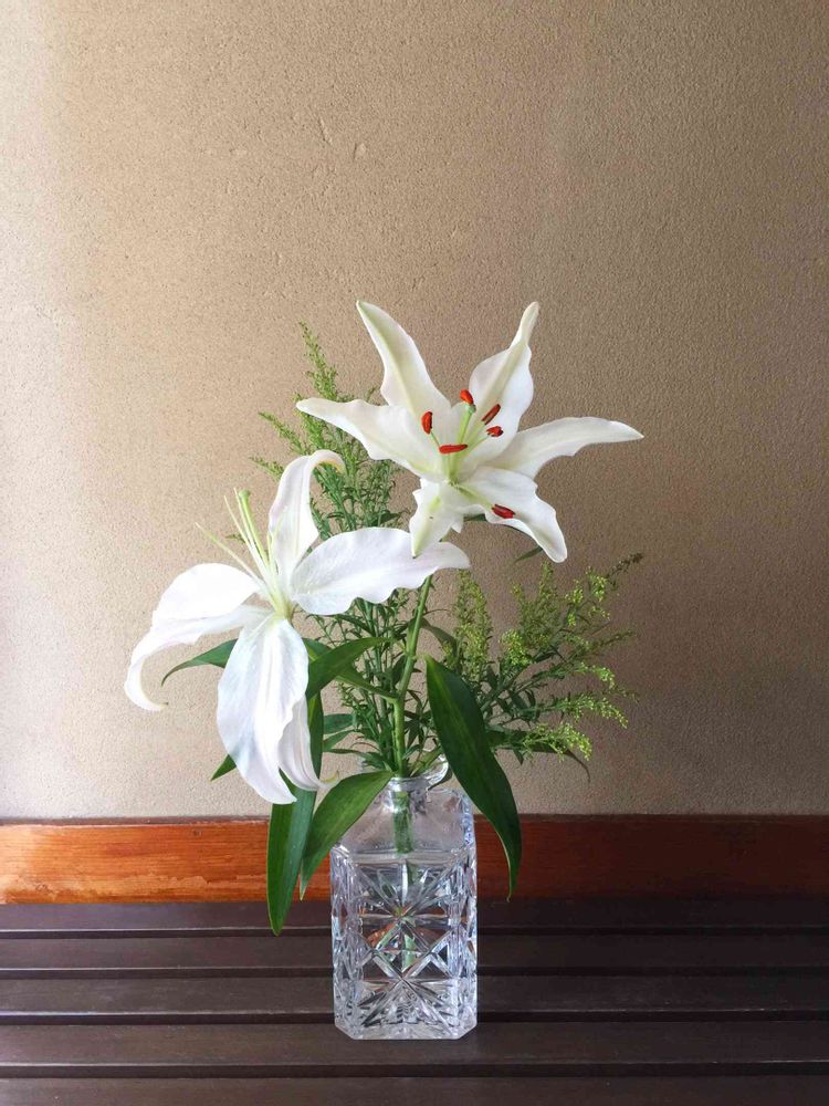 こんにちは😊いけばな教室の花材でいただいた時に咲いていた百合はすでにおしべが取られていたのですが、後で我が家で咲いた百合の方がおしべがアクセントになっていいですよね✨この瓶は重いので大きな百合にもビクともしなくて重宝してます🥃素敵に見えて良かったです💐ありがとうございました💖