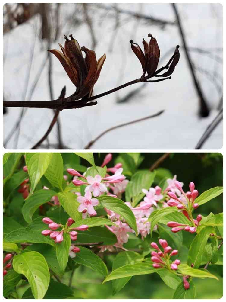 これは春から初夏に綺麗な花を咲かせるタニウツギの花(下:2019年5月撮影)とその実(上:2020年1月12日撮影)です。